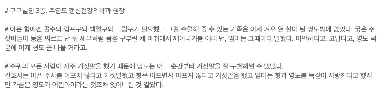 누군가의 뜻 없는 미소를 나를 향한 비웃음으로 뒤틀어 받아들이지 않으려면, 잘 지내보자고 내미는 손을 나도 모르게 순식간에 할퀴어 버리지 않으려면, 일흔이 넘어 백발이 된 머리카락으로 부모의 무덤에 찾아가서 그땐 나한테 왜 그랬냐고 울지 않으려면, 우리는 더 늦기 전에 그 어린아이를 만나야 하지 않겠냐고..