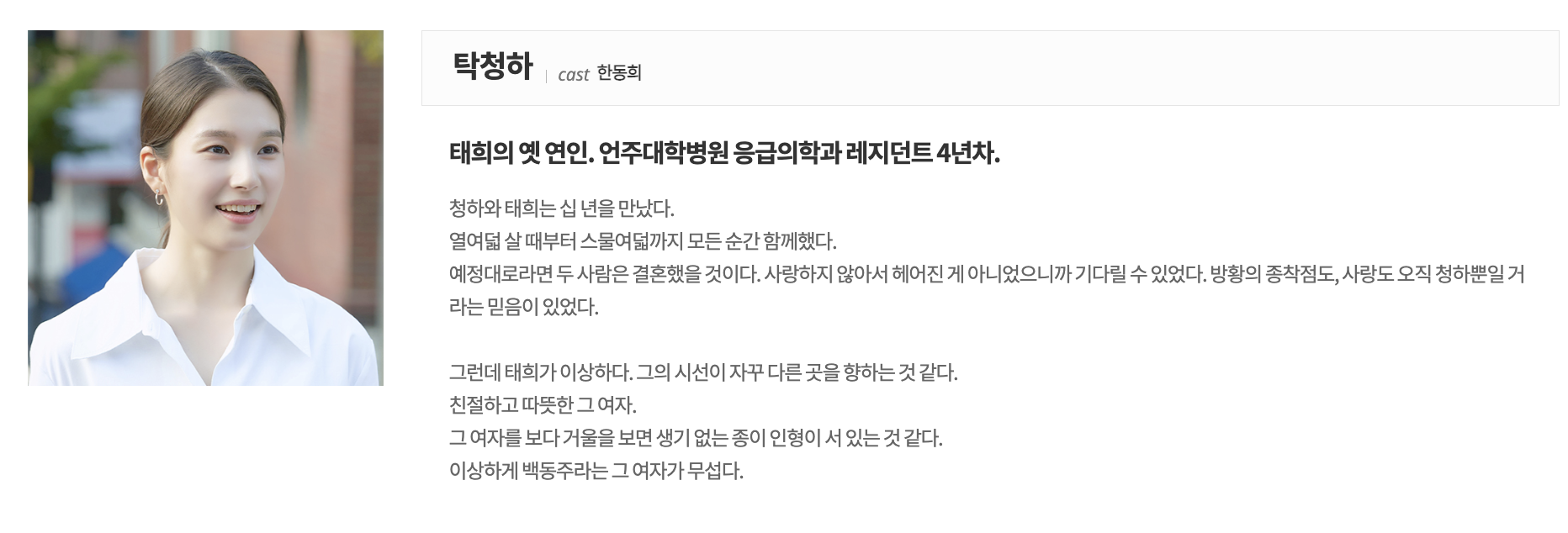 그를 건드리는 건 장례지도사인 백동주라는 여자. 이상한 여자라고, 미친 여자라고 생각을 하지만, 그녀에게 자꾸 눈이 향하는 태희