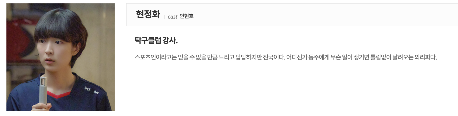 한때 백동주는 라켓만 쥐면 펄펄 날아다녔던 탁구의 에이스 상비군으로 태극마크도 달고 있었습니다. 올림픽에서 딴 금메달을 아버지한테 걸어주기만을 기대했지만, 12년의 탁구 인생에 발목 부상으로 인해서, 허무하게 탁구 라켓을 내려놓았습니다. 다 지난 일 그리고 더 이상 꺼내고 싶지 않은 얘기로 바뀌게 되었고 그보다 중요한 건 주특기였던 강한 스매시 실력으로 누군가의 따귀를 사정없이 때려야 되니까..
