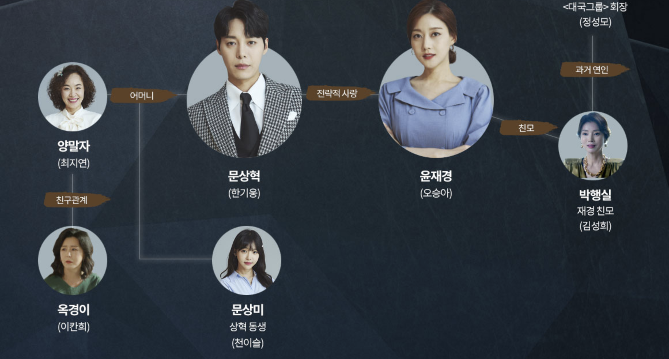 대국그룹의 복지재단 이사장이며, 겉은 우아하며 차분한 성격처럼 보이지만, 내면에는 치밀하고 집요하고 불같은 무서운 분노가 도사리고 있다.
