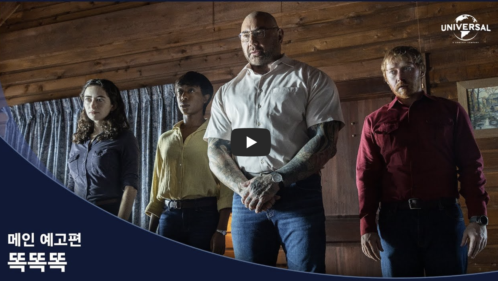 영화 <똑똑똑>은 원작 소설 [세상 끝의 오두막]을 기반으로 만들어져, M. 나이트 샤말란 감독의 솜씨로 더욱 풍부하고 감동적인 이야기로 재탄생했습니다. 선택과 가족에 대한 진지한 물음을 던지며 관객들을 생각하게 하는 이 작품은 한순간도 눈을 뗄 수 없는 긴장감을 선사합니다.