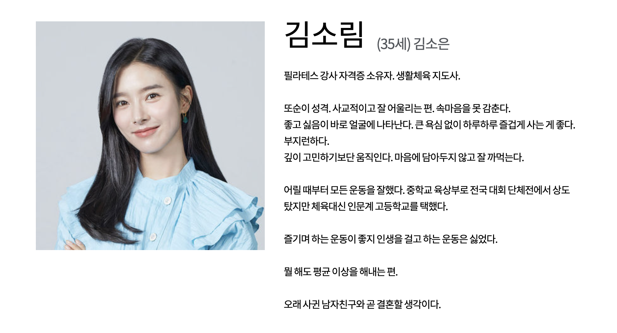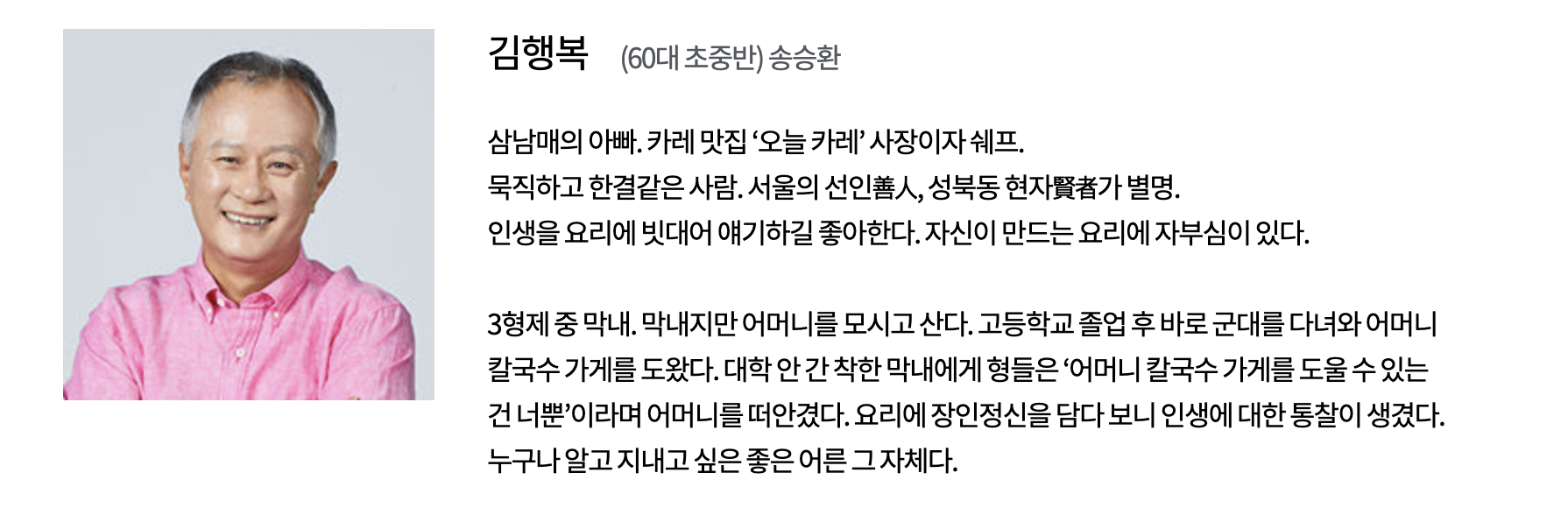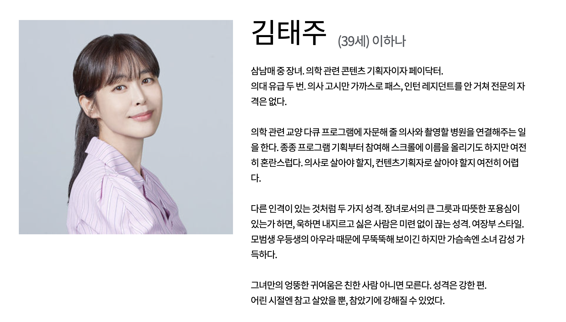 2. 한국형 장녀와 한국형 장남 한국현 장녀 스타일로 가족을 위한 책임과 희생을 내재화하며 산 딸들. 60~70년대 도시로 상경해 식무살이를 하거나 공장에 다니며, 동생들의 학비와 집안의 생활비를 내면서 큰 언니였던 큰누나의 족보는 현재 2030세대에도 이어져서 k 장녀란 신조어가 탄생하게 된다. 어릴 때부터 완벽한 장녀로 살아온 K장녀 김태주. 늘 성숙했던 K 장녀에게는 도전과 사랑의 기회를 한 번 더 주고자 한다.