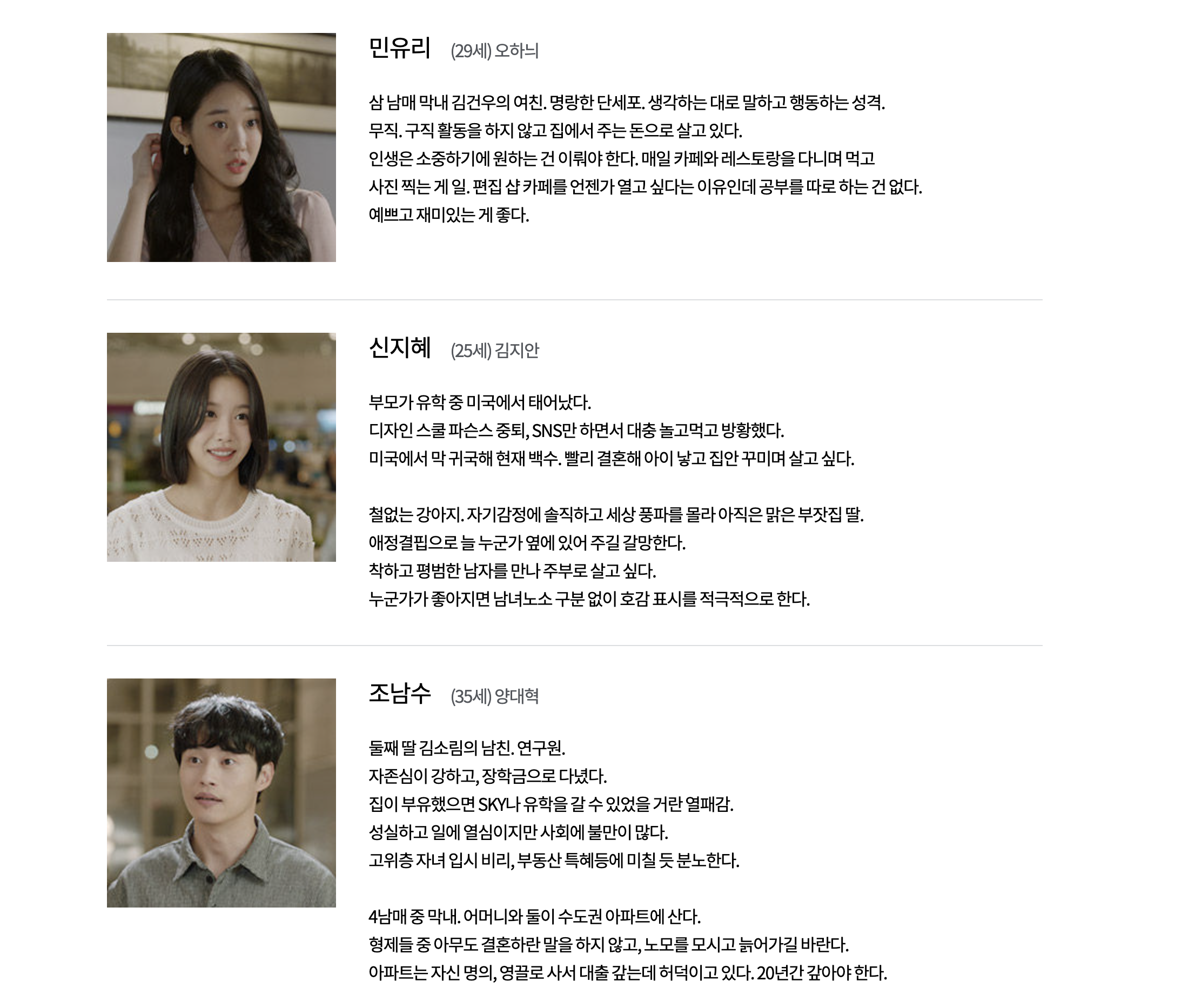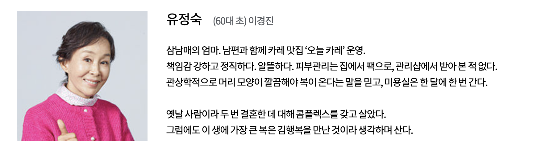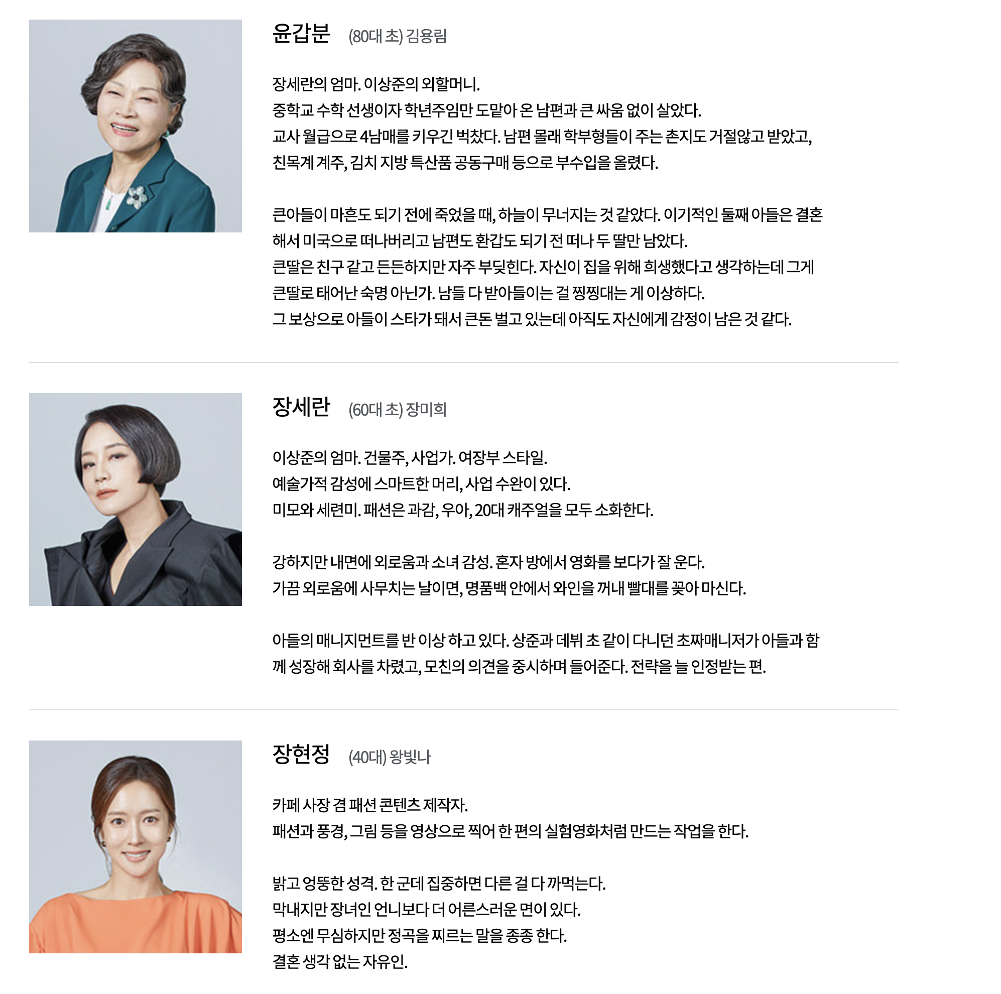2. 한국형 장녀와 한국형 장남 한국현 장녀 스타일로 가족을 위한 책임과 희생을 내재화하며 산 딸들. 60~70년대 도시로 상경해 식무살이를 하거나 공장에 다니며, 동생들의 학비와 집안의 생활비를 내면서 큰 언니였던 큰누나의 족보는 현재 2030세대에도 이어져서 k 장녀란 신조어가 탄생하게 된다. 어릴 때부터 완벽한 장녀로 살아온 K장녀 김태주. 늘 성숙했던 K 장녀에게는 도전과 사랑의 기회를 한 번 더 주고자 한다.