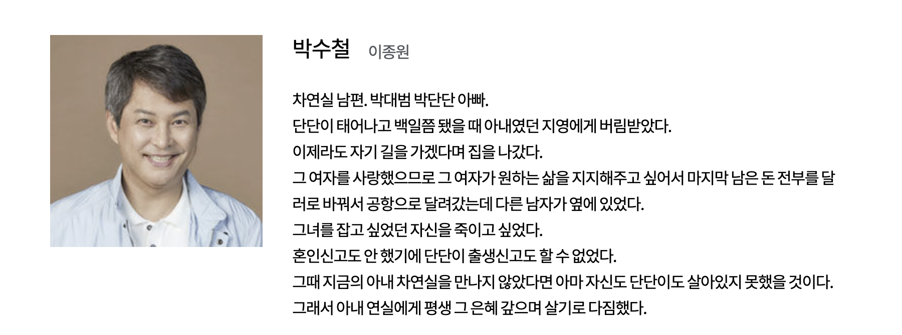 재니, 세찬, 세종이 아빠이며, 세련이의 이복 오빠이다.