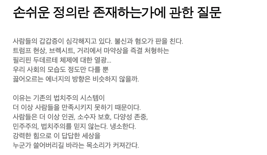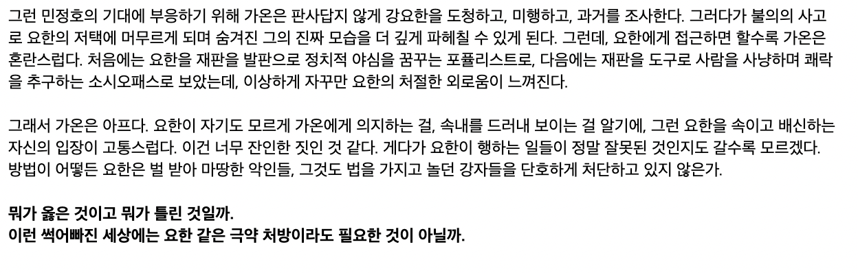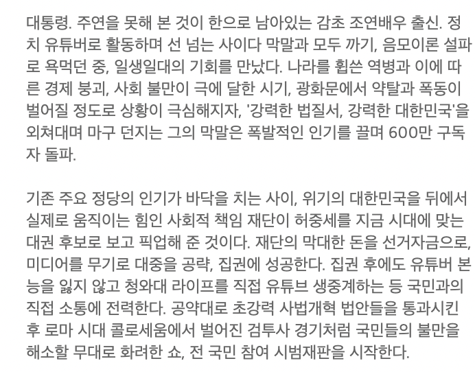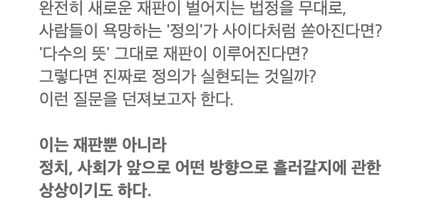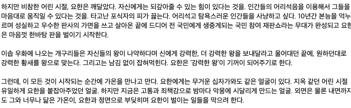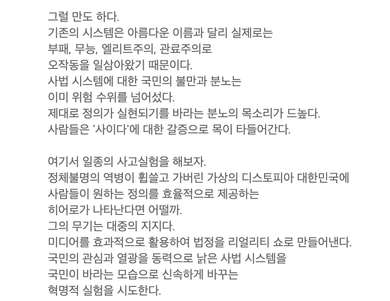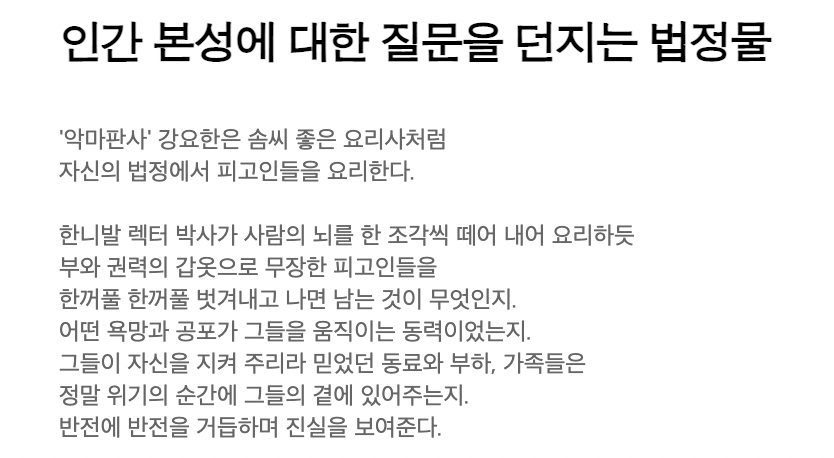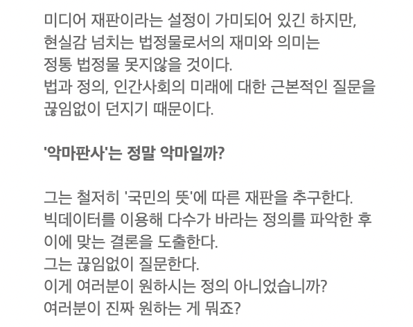 가상의 디스토피아 대한민국 안에서 벌어지게 되는 전 국민이 참여하는 리얼리티 법정 쇼라는 설정으로 시작하게 됩니다. 재판을 티브이 프로그램과 같이 만들어 피고인을 판사의 마음대로 부려먹는 악마 판사 강요한이 추구하는 정의에 대해서 궁금하게 되네요.