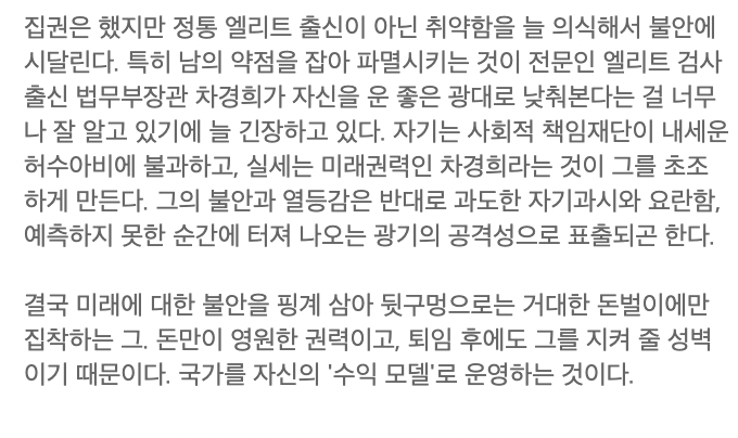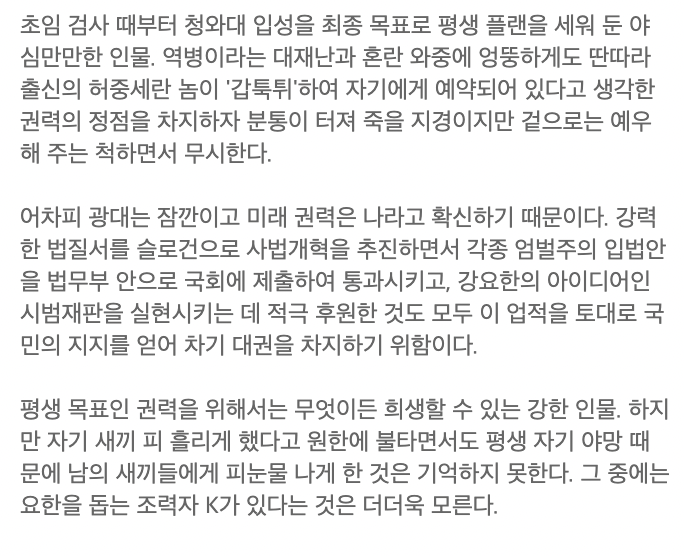 여당 차기 대권 후보 선두주자로 나오게 되며, 정통 엘리트 검사의 역할입니다.
