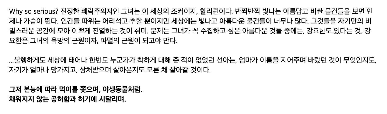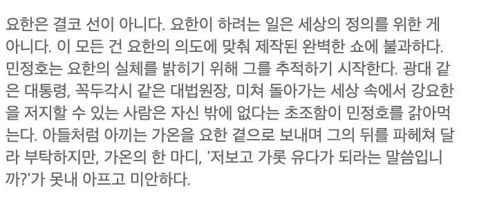 강요한은 모든 인간을 평등하게 혐오합니다. 부자, 가난한 자, 강자와 약자 자신과 다른 모두에게 가혹하게 합니다. 그리고 위선과 자기 합리화를 일삼는 인간들을 싫어합니다.
