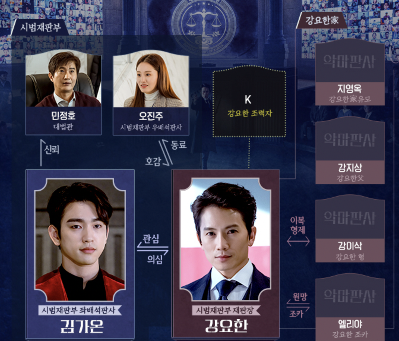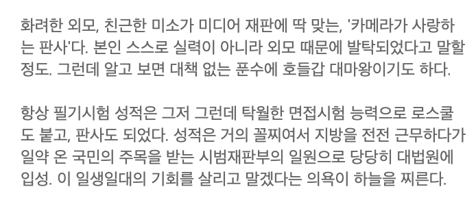 방송 첫 화부터 시범재판부 스타덤에 등극하는 젊은 판사로 나옵니다. 강요한을 쳐다보는 가온 얼굴 포스터에 팬들은 나는 반대한 다온 시선이 가는 미소년이지만 질풍노도의 비행청소년 출신으로 나오는 숨겨진 거친 매력이 있습니다.