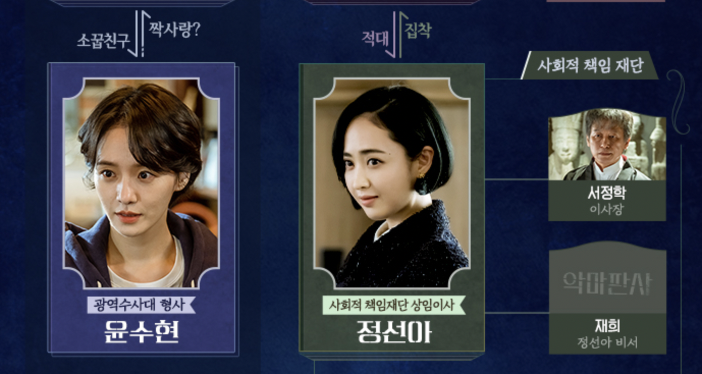 강요한의 유일한 최대 숙적으로 나오는 인물입니다. 사회적 책임 재단에서의 상임이사의 역할을 맡고 있으며, 강요한을 위기로 몰아넣고 사냥감 취급을 하는 유일한 존재로 나옵니다. 치미 하고 유능하고, 가차 없는 인물로 나옵니다. 훌륭한 말솜씨와 능숙하게 사람을 다루는 기술 그리고 사람들의 진짜 욕망이 무엇인지 꿰뚫어 보는 것이 그녀의 최대 무기입니다.