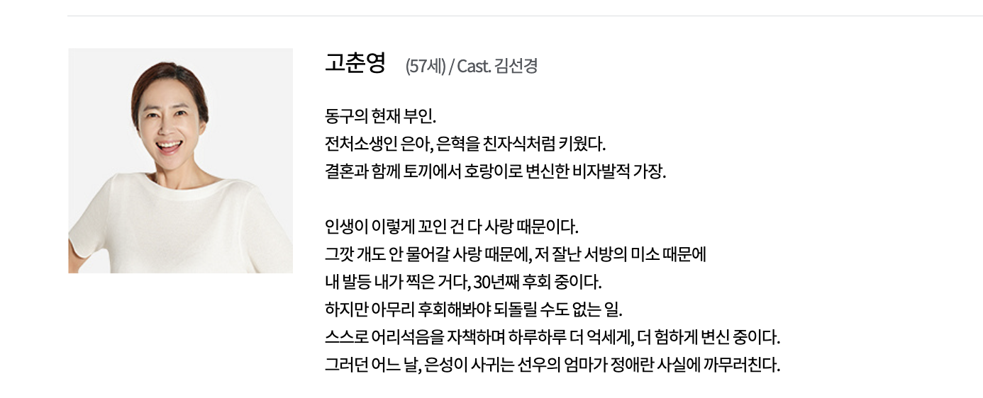 • 유은성 (남상지 역): 무명 배우로서 꿈을 키우는 청년으로, 미웠던 아버지와 함께 가족이 되어가는 이야기를 그린 인물입니다.