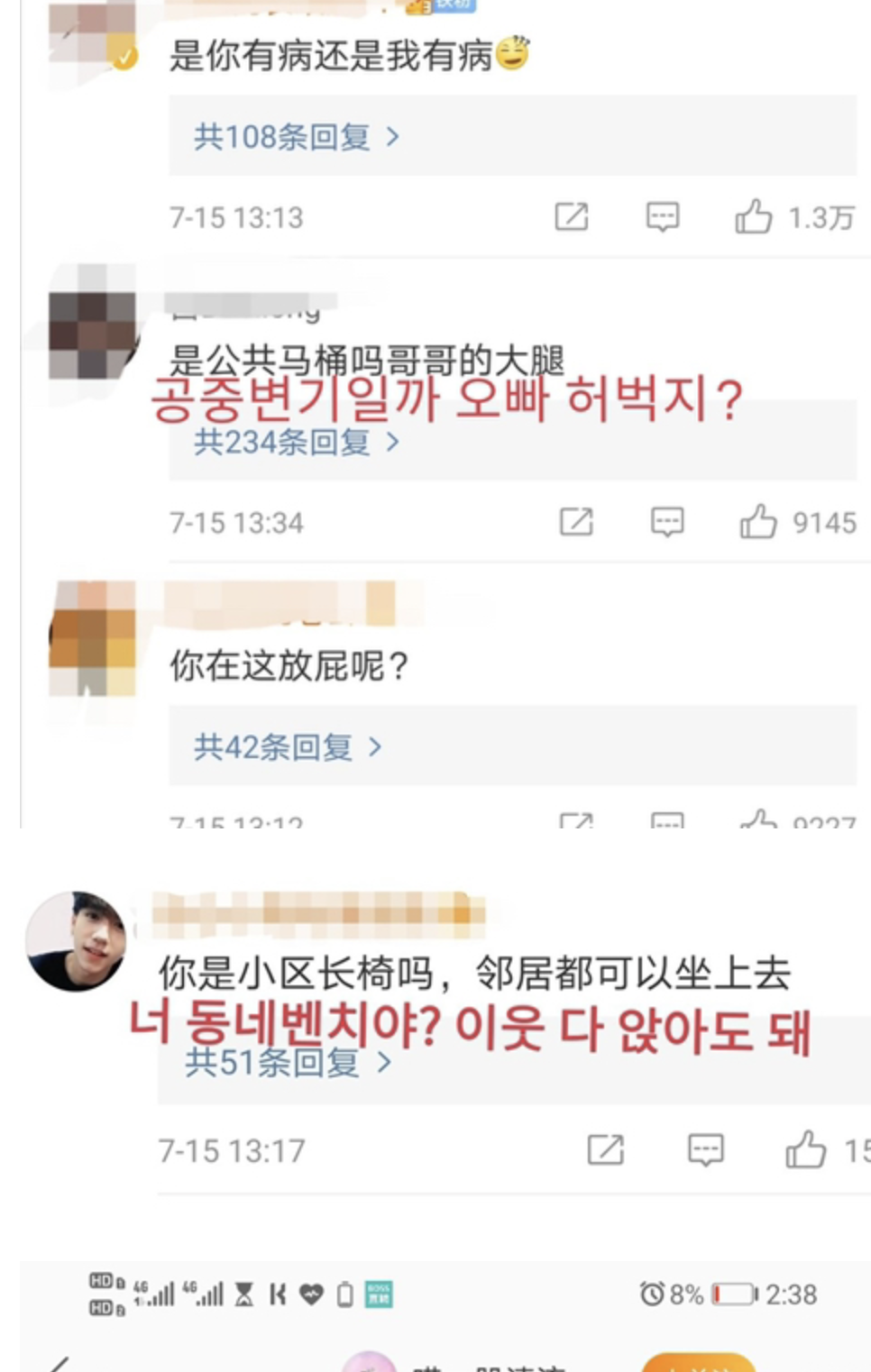 우효광의 웨이보 계정에는 "왜 이웃을 무릎에 앉히는지 이해가 안 간다." "니 무릎이 동네 벤치냐 이웃을 왜 않히냐?, "허벅지가 공중화장실이냐 무릎에 앉히게", "유부남이 이성 친구를 무릎에 앉게 하는 게 정상이냐"와 같은 비난이 이어지고 있습니다.