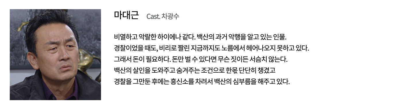 겉으로는 멋있으면서 호탕한 사업가라고 다니지만, 뒤에서 보는 그는 한 번 물었던 먹잇감을 절대 놓치지 않는 한 마리의 야수다.