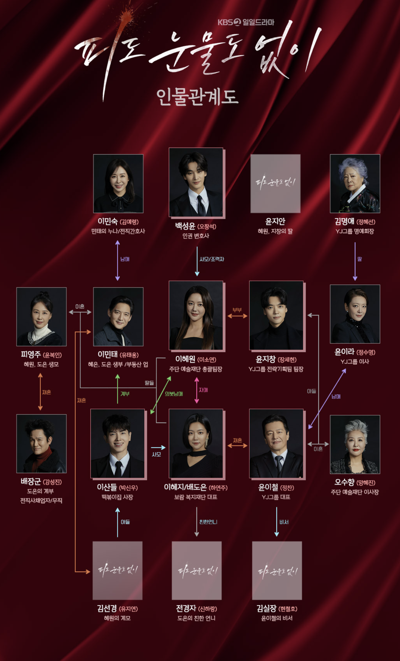'피도 눈물도 없이'는 이혼 후 각자 다른 삶을 살아가던 자매가 운명에 의해 어른이 된 형제 자매로 만나게 되면서 벌어지는 가족과 운명의 이야기를 그립니다. 이혜원은 완벽주의자이자 강렬한 성격으로 주단예술재단을 이끌고 있습니다. 한편, 이혜지는 보람복지재단 대표로 불우한 이웃들을 돕고 있습니다.