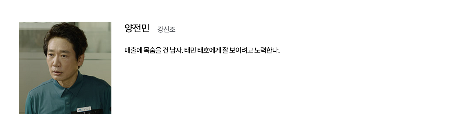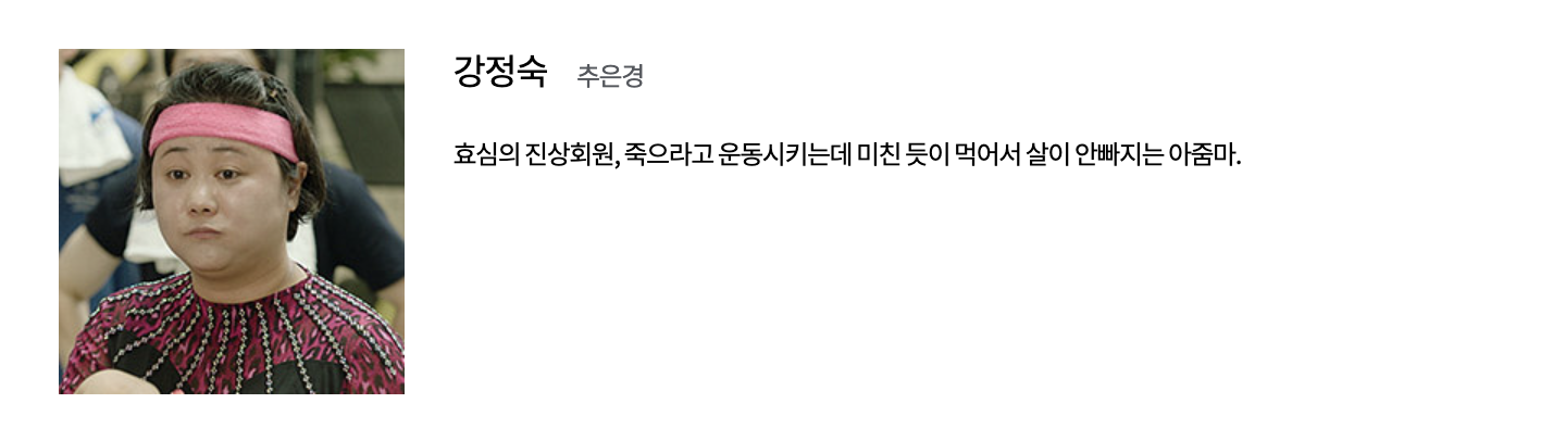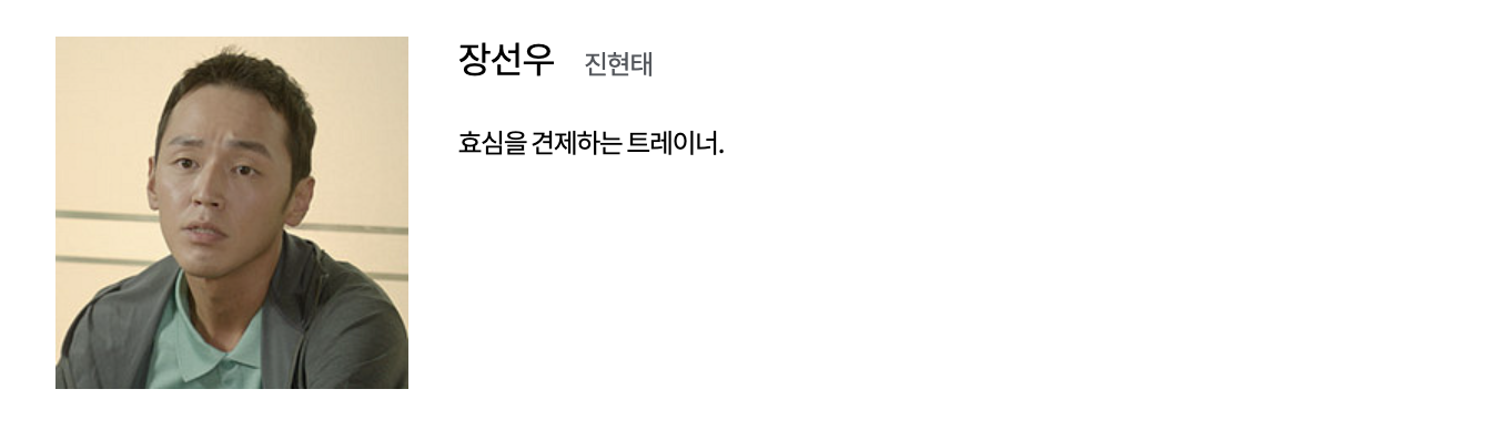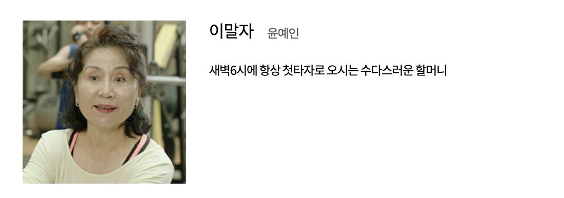 이효심 (유이 역): TS 피트니스의 트레이너로 근로자와 감정 노동자의 역할을 수행합니다. 어린 나이에 가족을 위해 어깨를 들어주며 대학을 중퇴하고 실직 가장의 역할을 시작한 효심은 무서운 일에도 불구하고 일터에서 인정을 받는 열정적인 트레이너입니다.