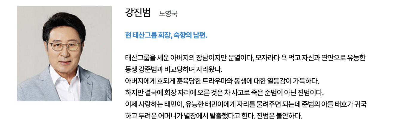 강태민 (고주원 역): 태산그룹의 후계자로, 강진범 회장을 대신하여 회사를 이끌기로 계획하고 있습니다. 복역 후 기업 세계로 돌아오게 되며, 태호의 귀국과 그룹의 지배권을 놓고 펼쳐지는 경쟁에 참가합니다.