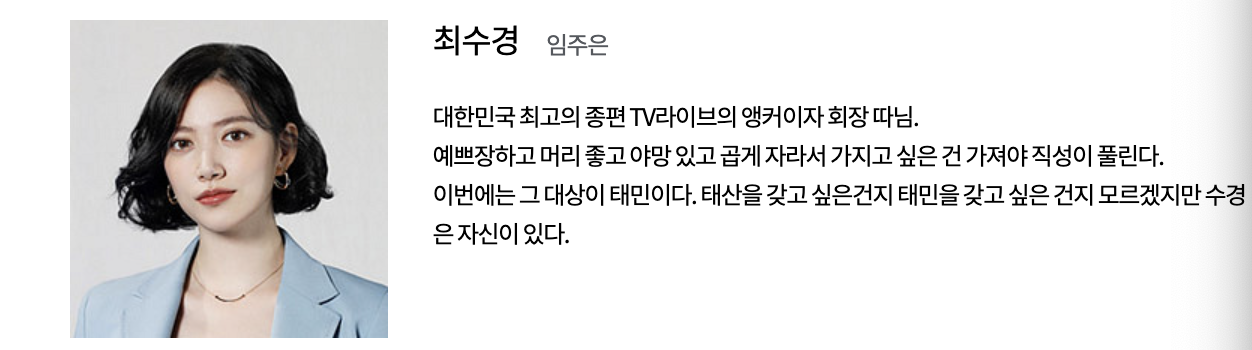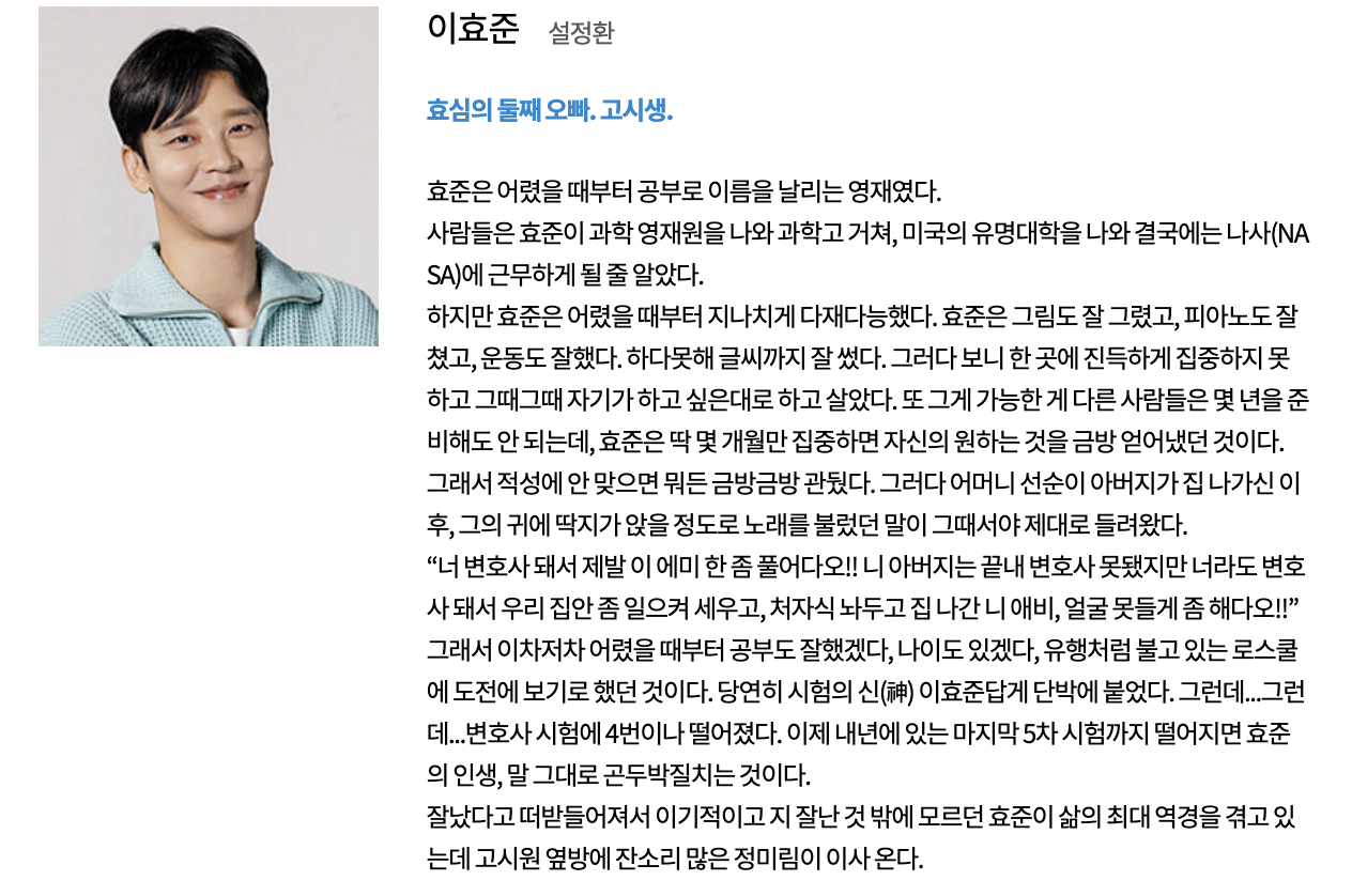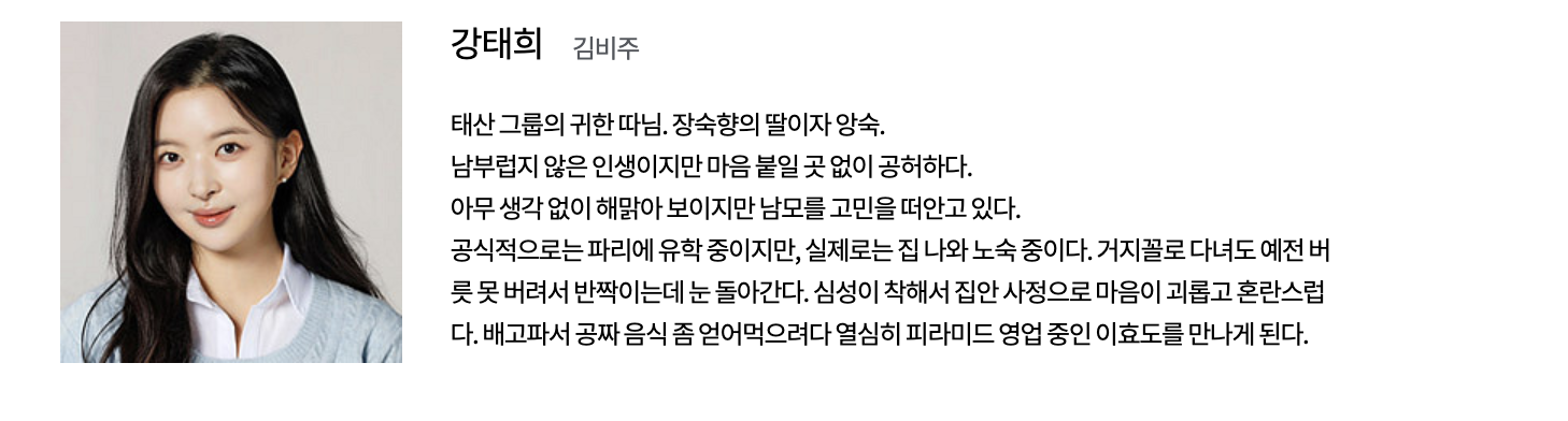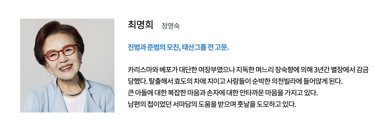강태호 (하준 역): 대한민국에서 가장 큰 대기업 중 하나인 태산그룹의 창업자의 손자로, 미국에서 유학하며 교수가 되기를 계획했던 청년입니다. 할머니의 행방을 찾기 위해 한국으로 돌아온 후, 효심과 만나게 되며 둘 사이의 갈등이 시작됩니다.