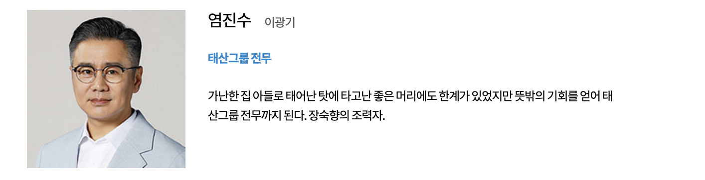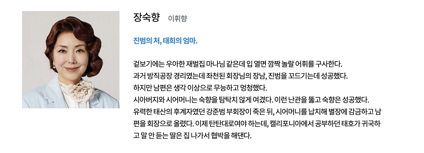 강태민 (고주원 역): 태산그룹의 후계자로, 강진범 회장을 대신하여 회사를 이끌기로 계획하고 있습니다. 복역 후 기업 세계로 돌아오게 되며, 태호의 귀국과 그룹의 지배권을 놓고 펼쳐지는 경쟁에 참가합니다.
