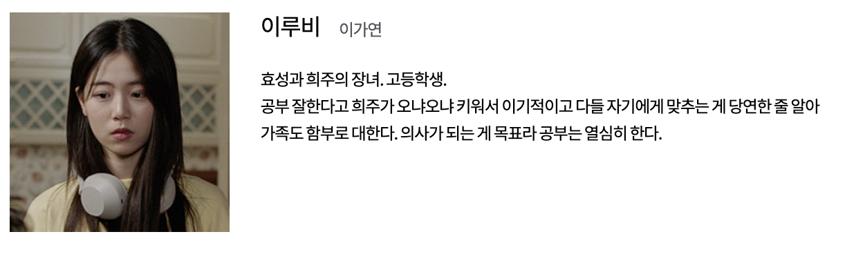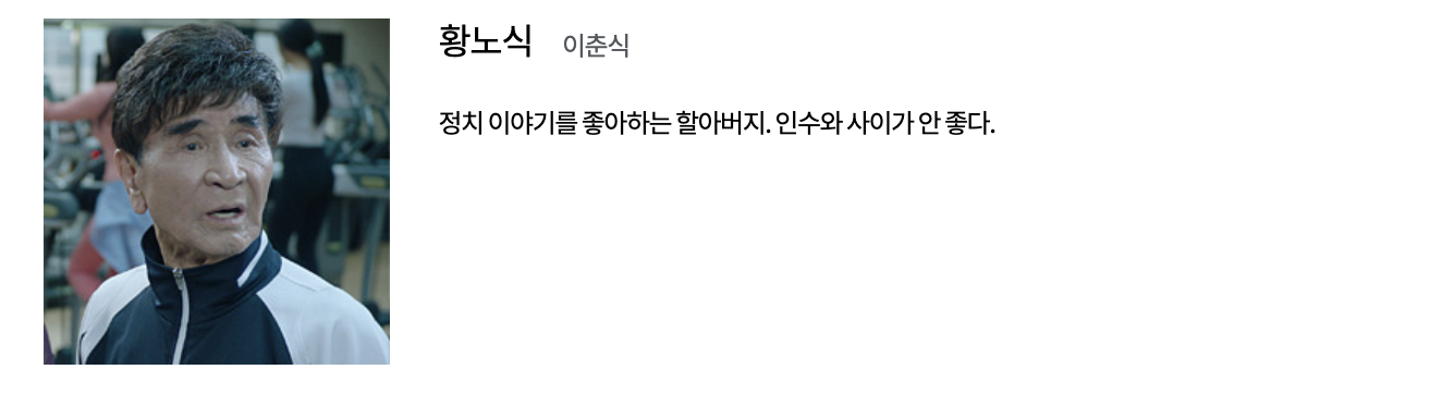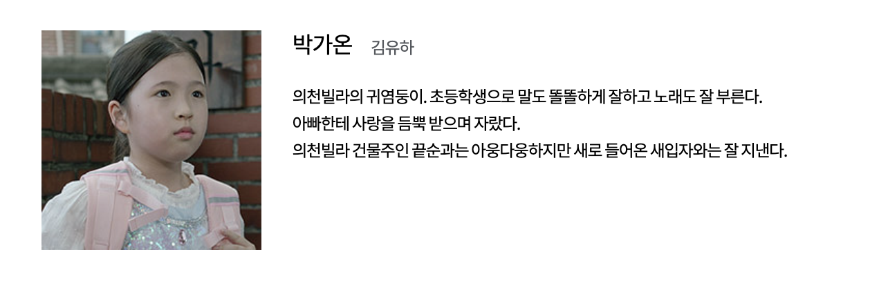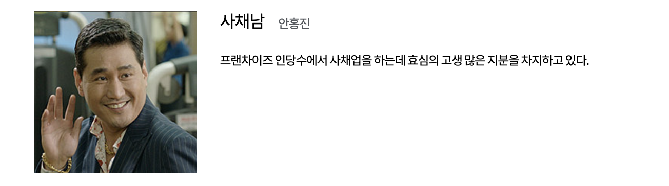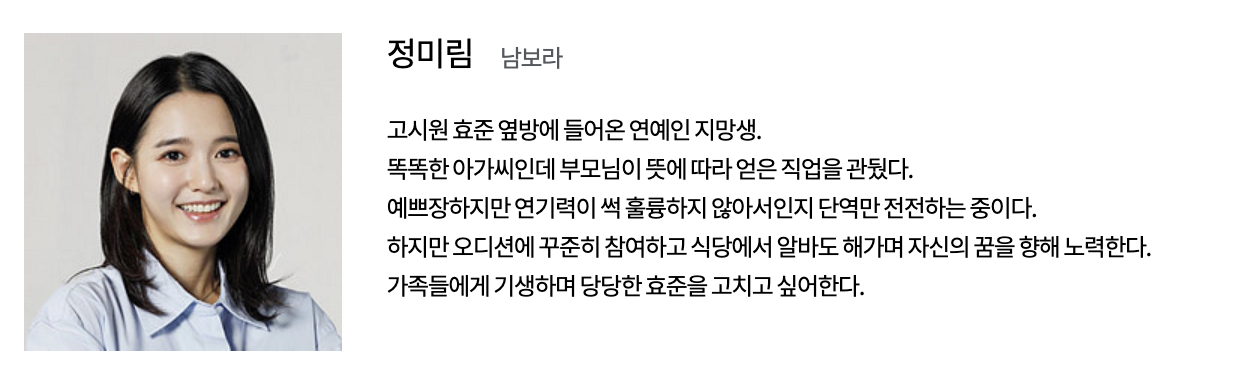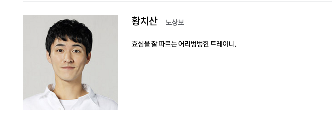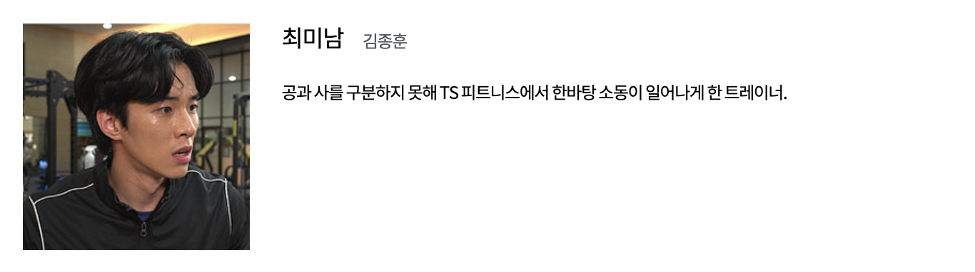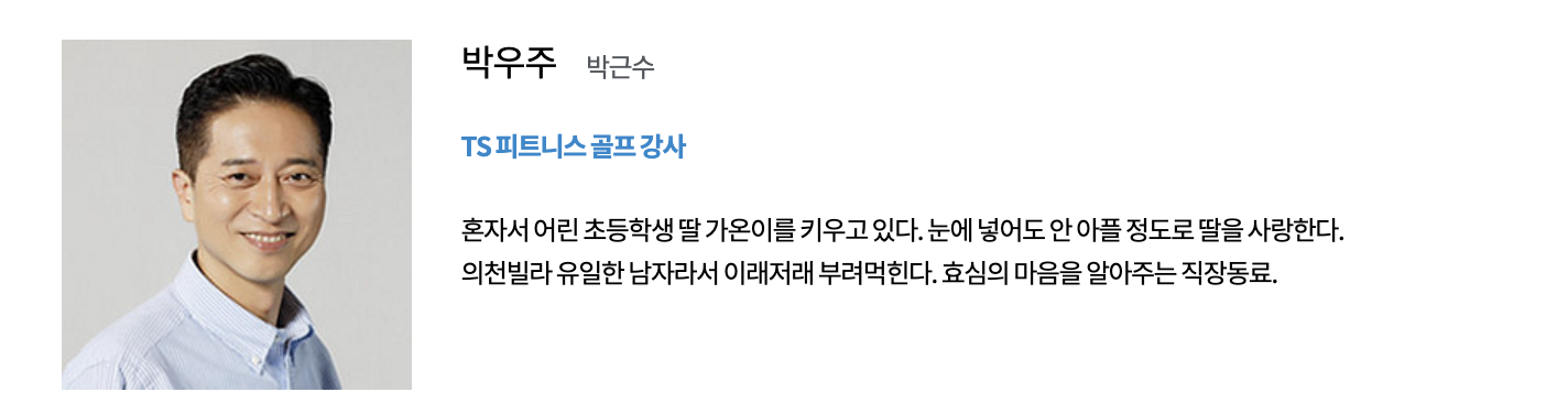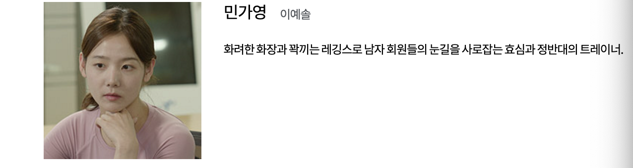 이효심 (유이 역): TS 피트니스의 트레이너로 근로자와 감정 노동자의 역할을 수행합니다. 어린 나이에 가족을 위해 어깨를 들어주며 대학을 중퇴하고 실직 가장의 역할을 시작한 효심은 무서운 일에도 불구하고 일터에서 인정을 받는 열정적인 트레이너입니다.